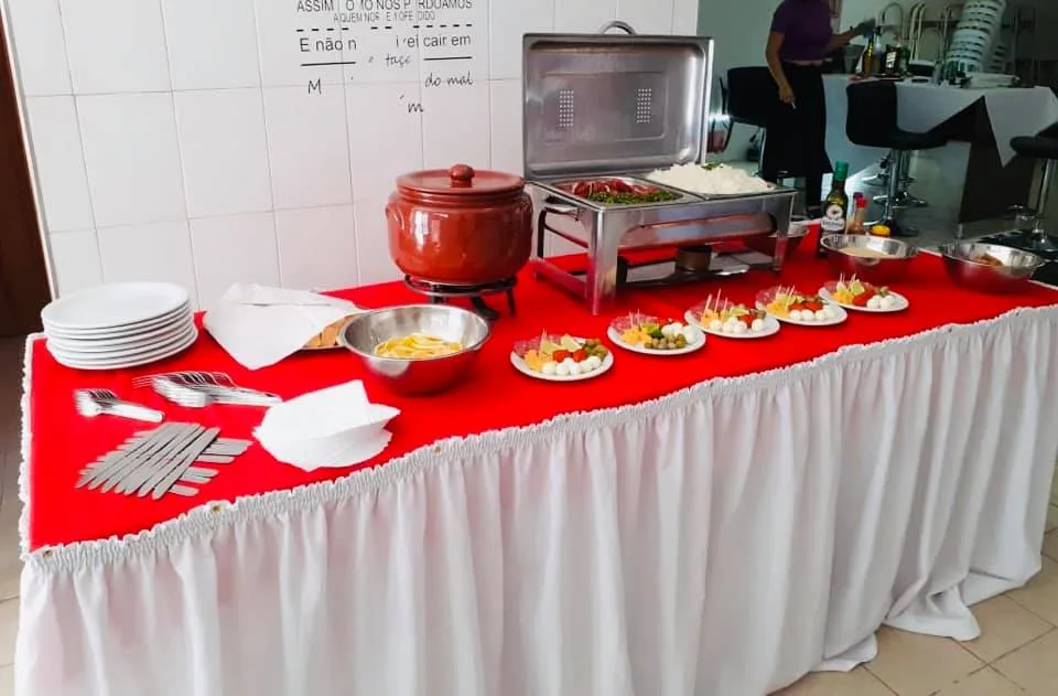 Cozinheira, garçom e auxiliar chegam antes, montam, servem com educação e vão embora com tudo limpo. Sem improvisos.