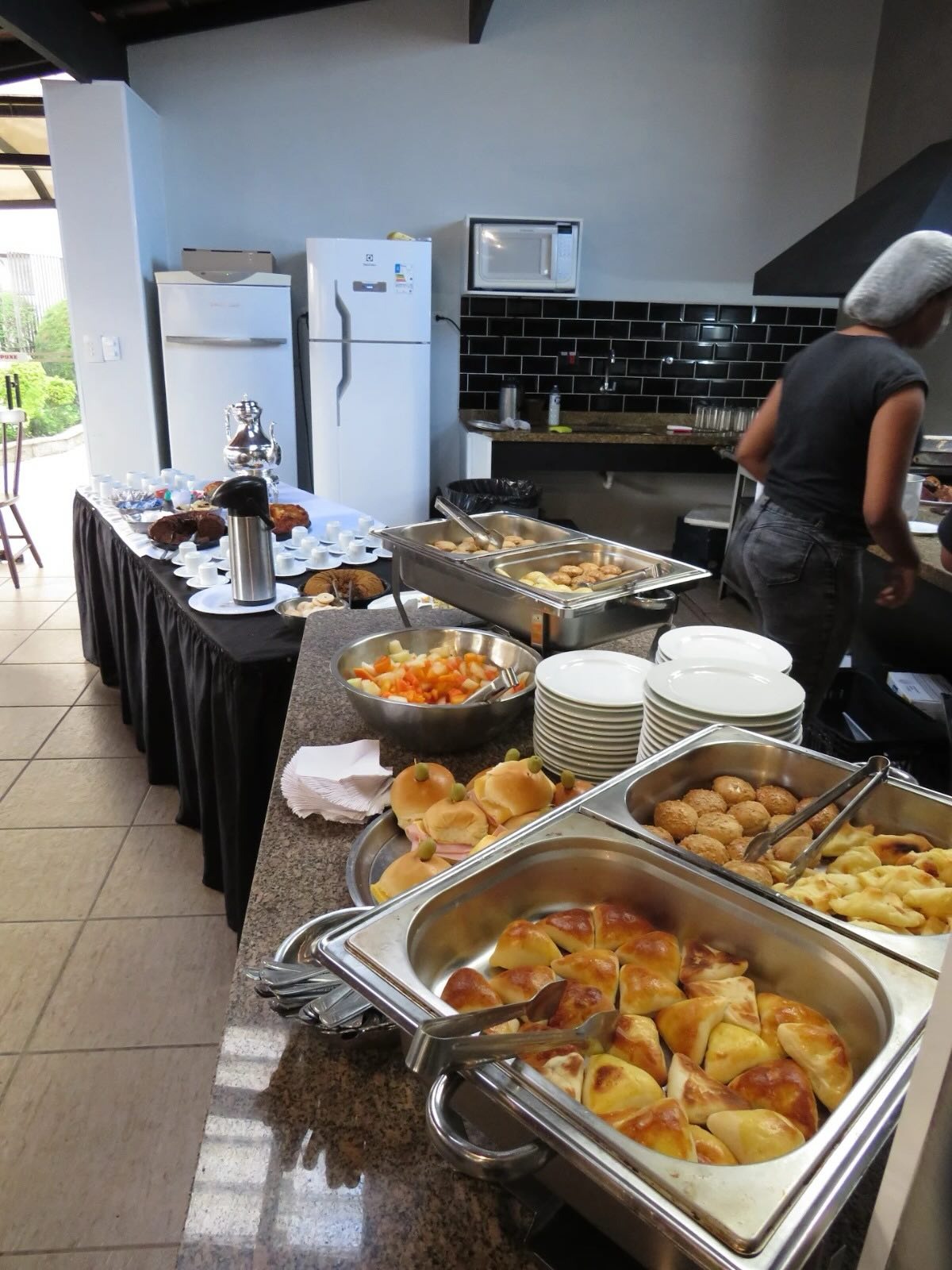 - Cozinheira, garçom e auxiliar — uniformizados