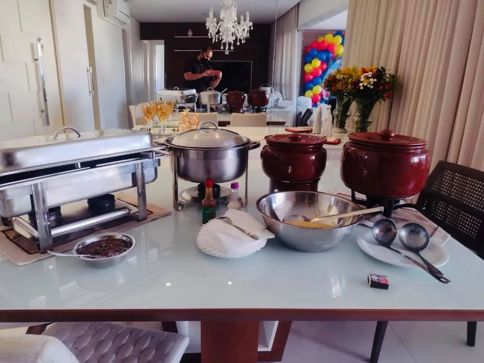 Cozinheira, garçom e auxiliar chegam antes, montam, servem com educação e vão embora com tudo limpo. Sem improvisos.